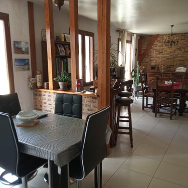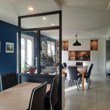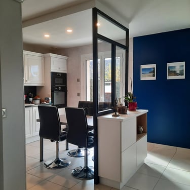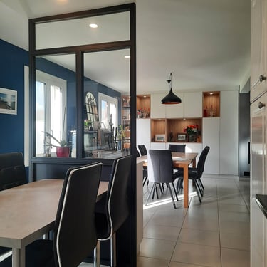 Réorganisation de l'espace repas dans la cuisine avec la création d'une verrière et d'une retombée de plafond.
